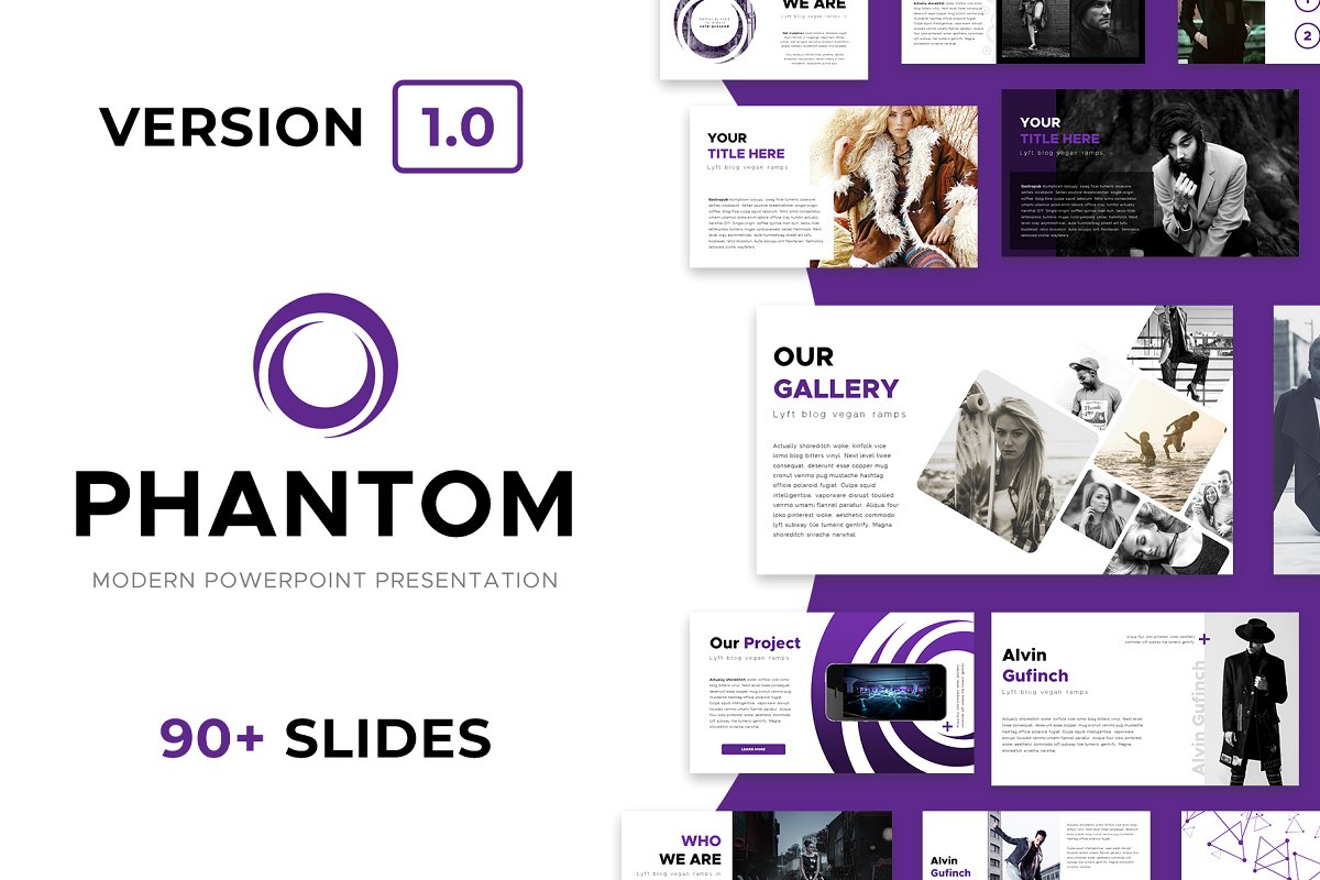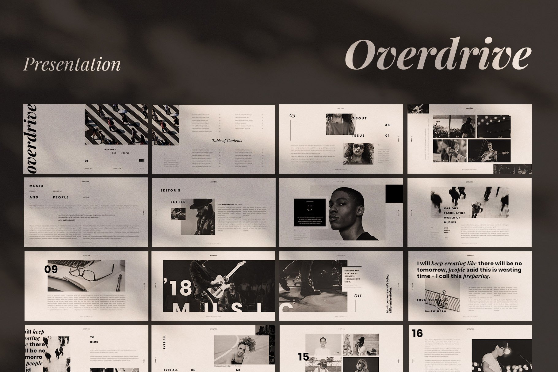 Overdrive Powerpoint template by Visuel Colonie® is a monochromatic template spread over fifty clean slides. It has a stylish editorial feel. This can be seen in the elegant pullquotes, captions, headlines and rotated headlines which run upward from the side. While the artistic feel of these larger text sizes may need to be reigned back a little to please more conservative clients, the overall
